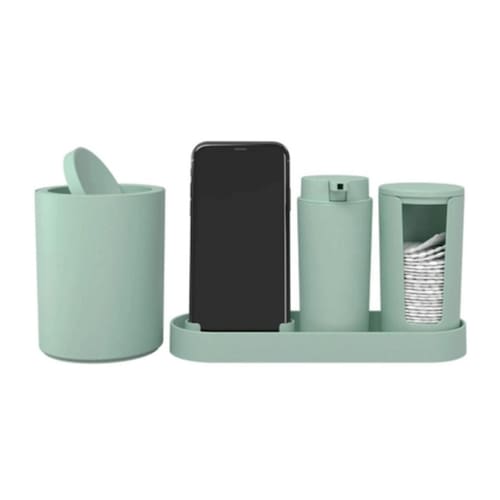 Conjunto para Banheiro Serene Coza Lixeira 1L Porta Sabonete Discos Algodão Celular Verde 4pçs.Garantia: 90 dias / Peso total: 0,518kg / Cor predominante: verde / Ref: 7896553948998;Dimensões da lixeira basculante: 11,5cm (d) x 14,5cm (a);Capacidade da lixeira basculante: 1 litro;Dimensões do porta sabonete líquido: 8cm (c) x 6,5cm (l) x 14,5cm (a);Capacidade do porta sabonete: 290ml;Dimensões do porta algodão em discos: 6,5cm (d) x 13,5cm (a);Dimensões da bandeja: 26cm (c) x 8cm (l) x 2,5cm (a);Dimensões do porta celular: 9,5cm (c) x 2cm (l) x 2cm (a);Material: polipropileno, bpa free;Cuidados: não utilizar materiais abrasivo na limpeza dos produtos;Conteúdo: 1 lixeira basculante, 1 porta algodão em discos, 1 porta sabonete líquido e 1 bandeja com porta celular.Feito com plástico de alta qualidade e acabamento soft acetinado, este conjunto de banheiro é parte da linha de produtos Serene, cuidadosamente projetada para elevar os momentos de autocuidado diário. O porta sabonete líquido é a solução perfeita para manter o seu sabonete sempre à mão, podendo acomodar sabonete facial ou outro item de skincare, e se encaixa perfeitamente em qualquer espaço contribuindo para manter o banheiro organizado. Desfrute de momentos relaxantes assistindo a tutoriais de maquiagem ou ouvindo suas músicas favoritas com a bandeja para bancada que oferece um espaço para apoiar o seu celular. A lixeira é perfeita para o descarte de discos de algodão, cotonetes e outros resíduos comuns em sua rotina de cuidados pessoais. O porta algodão é projetado para acomodar discos de algodão e deixá-los organizados e prontos para uso. O verde claro é um tom romântico que traz cor para o ambiente de forma elegante e sutil. Este conjunto acrescenta um toque de sofisticação e tranquilidade, fazendo com que você se sinta envolto em uma sensação de serenidade enquanto cuida da sua saúde. Seu design moderno e minimalista se adapta a qualquer ambiente, independentemente do estilo de decoração. Adicione estilo e praticidade ao seu banheiro com o kit cuidados com a pele Serene. Cuide da organização e do seu bem-estar com elegância e eficiência, enquanto faz a sua parte para um mundo mais sustentável. Escolha qualidade, escolha Serene da Coza. Adquira o seu agora mesmo!