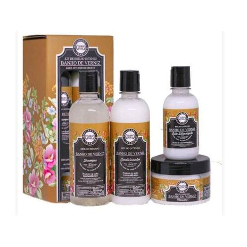 Kit Banho de Verniz Para melhorar a fibra capilar e dar um brilho intenso Muita tintura e alisamentos danificaram seu cabelo Então aposte neste Kit. Vai alinhar as cutículas dos fios melhorando a fibra capilar, além de eliminar aquele tão indesejado frizz. Não é por acaso que este Kit recebe este nome. Possui uma fórmula superconcentrada que vai deixar seus cabelos com o brilho do verniz. Você vai sentir diferença já no primeiro dia de uso.