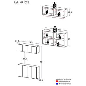 Dimensões do produto montado: Armário Aéreo - Altura: 39,5cm | Largura: 123,5cm | Profundidade: 31,5cm Aparador - Altura: 70cm | Largura: 123cm | Profundidade: 31,5cm *Você pode consultar as medidas detalhadas na imagem técnica do produto.