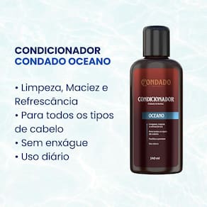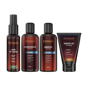 Kit Condado Oceano - Shampoo + Condicionador + Gel de Barbear + Loção Pós-Barba O Kit Condado Oceano foi desenvolvido para homens que valorizam o cuidado pessoal e desejam uma rotina completa e refrescante. Com fragrância inspirada na brisa marítima, este kit combina limpeza, preparo e proteção da pele e dos fios, garantindo uma experiência sofisticada e revigorante do início ao fim do barbear. O Shampoo Condado Oceano limpa profundamente cabelo e barba, removendo impurezas e oleosidade sem ressecar. O Condicionador hidrata e fortalece os fios, devolvendo maciez e brilho natural. Já o Gel de Barbear Condado Oceano proporciona deslizamento suave da lâmina, reduz irritações e facilita um barbear mais preciso. Finalizando, a Loção Pós-Barba Condado Oceano acalma e refresca a pele, auxiliando na cicatrização de microlesões e deixando um toque suave e perfumado. Fragrância Oceano Refrescante, leve e sofisticada, inspirada na brisa do mar. Ideal para homens modernos que buscam energia e vitalidade em sua rotina de cuidados. Benefícios do Kit: Limpeza profunda e equilibrada para cabelo e barba Hidratação e fortalecimento dos fios Barbeado mais suave e preciso Ação e regeneradora após o barbear Sensação de frescor e perfume marcante Indicado para todos os tipos de cabelo, barba e pele Modo de uso: Shampoo: Aplique sobre o cabelo e/ou barba úmidos, massageie até formar espuma e enxágue bem. Condicionador: Após lavar, aplique nos fios úmidos, deixe agir por alguns minutos e enxágue. Gel de Barbear: Espalhe sobre a pele úmida e barbeie normalmente. Enxágue após o uso. Loção Pós-Barba: Aplique diretamente sobre o rosto e pescoço após o barbear, massageando suavemente até completa absorção. Precauções: Uso externo. Evite contato com olhos e mucosas. Em caso de contato acidental, enxágue com água em abundância. Suspenda o uso em caso de irritação ou alergia. Mantenha fora do alcance de crianças. Conservar em local fresco, ao abrigo da luz e calor excessivo. Marca: Não Informado