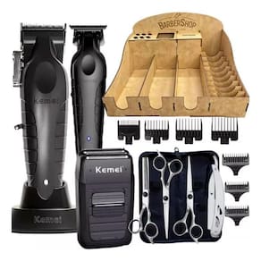 Kit Profissional para Barbeiros e Cabeleireiros com Suporte de Acessórios, kit Tesouras e Shaver O Kit Profissional para Barbeiros e Cabeleireiros foi desenvolvido para quem busca praticidade, qualidade e organização no dia a dia da barbearia ou salão. Composto por ferramentas essenciais, este kit garante cortes impecáveis e um acabamento refinado, elevando a experiência do cliente. Destaques do Kit: Máquina de Corte Profissional Kemei KM-2296 Potente e resistente, ideal para cortes de cabelo e barba. Acompanha 8 pentes guia para diferentes comprimentos. Máquina de Acabamento e Detalhes Kemei Km2299 Leve e precisa, perfeita para contornos, desenhos e finalizações impecáveis. Inclui 3 pentes para ajustes de altura. Shaver Kemei 1102 Ele é um barbeador elétrico para finalização que corta os pelos na raiz deixando a pele bem lisa como se tivesse passado Gillette ou navalha. Pode ser utilizado também para depilar partes do corpo e cabeça. Este shaver é ideal para pessoas que tenham alergia a lâmina da Gillette ou a navalha, que é um método muito agressivo, com o shaver não vai causar essa irritação. Lembrando que antes de usar o shaver é necessário passar uma máquina zero para cortar os pelos, depois vem o shaver. Ele não deve ser utilizado em pelos grandes. Kit de Tesouras Profissionais + Navalhete Essencial para cortes detalhados e técnicas avançadas. Inclui 2 tesouras retas e de 1 de desbaste. Suporte para Acessórios de Barbearia Organização total para armazenar máquinas, pentes, tesouras e outros acessórios com fácil acesso e praticidade. O que vem no kit 1 Máquina Profissional de Corte Kemei KM 2600, Com 4 Pentes guia: 3mm, 6mm, 10mm e 13mm 1 Máquina de Acabamento e Detalhes Kemei KM 9163, Ideal para contornos e desenhos 3 Pentes guia, nos tamanhos: 1/2, 1 e 1.1/2 1 Shaver kemei km1102. Kit Profissional de Tesouras e Navalhete em aço inox, com: 2 Tesouras retas para cortes precisos 1 Tesoura de desbaste para reduzir volume 1 Navalhete profissional para finalizações 1 Suporte Organizador para Barbearia: Espaço para armazenar até 3 máquinas 9 compartimentos para pentes, mantendo os organizados 6 espaços para tesouras, proporcionando fácil acesso 1 compartimento multiuso para outros acessórios Dispenser de lâminas para máxima praticidade. Este kit é a escolha ideal para barbeiros e cabeleireiros que buscam eficiência, organização e qualidade no atendimento. Invista nas ferramentas certas e eleve o nível dos seus serviços.