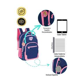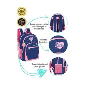 Design exclusivo: A estampa de coração bordado com o nome Barbie é um charme à parte. Conforto e praticidade: Alças de costas ajustáveis e acolchoadas para um transporte confortável, além de bolso lateral para garrafa de água. Acessório especial: Acompanha um chaveiro em formato de espelho, para as meninas se arrumarem a qualquer hora. Organização: Compartimento principal espaçoso para guardar todos os materiais escolares.