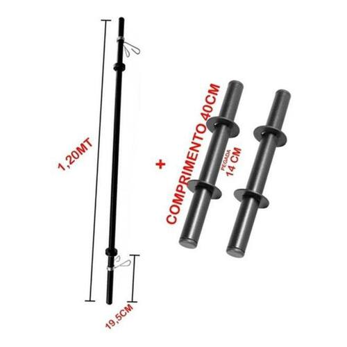 Kit Barra Body Pump + Par Barra Oca 40 Cm - 3 Unidades O kit é composto 1 Barra OCA 1,20 mt + 2 Presilhas A Barra OCA 1,20 m é ideal para os treinos em casa e na academia, produto de excelente qualidade e acabamento. Faça vários exercícios com esta excelente Barra , como bíceps, peito, glúteos, ombros, coxas, costas, agachamento e mais uma porção de variações. Com prático sistema de travas por presilhas permite trocas de anilhas mais rápidas Suporta aproximadamente 40 kg de anilhas Especificações Técnicas: - Barra Oca em aço - Feita em aço 1020 de 1 Polegada - Inclui limitador batedor de anilhas em PVC - Espessura parede do aço de 1,5 mm - Pintura eletrostática texturizada anti ferrugem - Acabamento das pontas em PVC - Presilhas de 3 voltas reforçada - Peso da Barra com presilhas 1,6 Kg ---------------------------------------------------------------------------------------------------- Barra Oca 40 cm Profissional Par - 2 Unidades + 4 unidades de Presilha A barra 40 cm Oca Com Presilhas é ideal para exercícios de peso livre e exercícios unilaterais. Com prático sistema de travas por presilhas permite trocas de pesos mais rápidas Suporta aproximadamente 60 kg de anilhas Especificações Técnicas: - Par de Barras Ocas em aço - Feita em aço 1020 de 1 Polegada - Espessura parede do aço de 2 mm - Pintura eletrostática texturizada anti ferrugem - Acabamento das pontas em PVC - Presilhas de 3 voltas reforçada - Suporta até 60 kg de anilhas total - Peso da Barra com presilhas 700 gramas