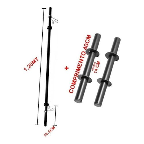 Especificações Técnicas: - Par de Barras Ocas em aço - Feita em aço 1020 de 1 Polegada - Espessura parede do aço de 2 mm - Pintura eletrostática texturizada anti ferrugem - Acabamento das pontas em PVC - Presilhas de 3 voltas reforçada - Suporta até 60 kg de anilhas total - Peso da Barra com presilhas 700 gramas Ean: 7890018703344