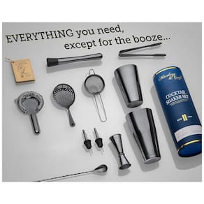 MISTURADOR DE BEBIDAS O Mixology Bartender Kit é um multifuncional ideal para agitar ou misturar álcool. Nosso shaker de bebida superior não vai quebrar ou congelar é o único conjunto que você precisará para o carrinho de bar KIT DE BARTENDING O conjunto de barras de 11 peças inclui uma lata de 530 a 830mL, um jigger de estilo japonês para facilitar a medição e despejar, muddler, 2 dosadores de líquidos, uma colher de bar, pinças de gelo e 3 tipos de filtros para segurar o gelo voltar. Todas as ferramentas que você precisa para inventar bebidas alcoólicas MISTURADORES ESTILOSOS O conjunto de coquetéis pesados é bem equilibrado e adiciona uma textura espumosa aos coquetéis. É do tamanho certo para misturar bebidas em um shake. Ele sela, mas separa e ajudará você a fazer uma margarita, martini, à moda antiga, mojito e muito mais FÁCIL DE USAR Nosso conjunto de bartender de aço inoxidável tem uma vedação perfeita à prova dágua foi projetado para evitar que o líquido vaze do shaker e evite que as latas fiquem presas. Agite o quanto quiser ESSENCIAIS DE BARWARE Chega de bancadas molhadas ou desordenadas Uma vez feito isso, embale e guarde as ferramentas da barra dentro de um tubo de transporte. É um ótimo presente de boas vindas para uma nova casa e inclui um catálogo de receitas de coquetéis online