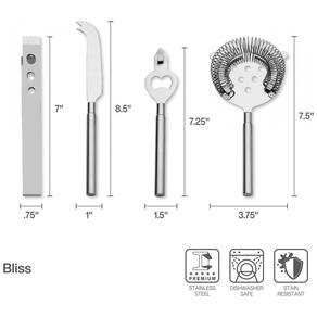 FERRAMENTAS ESSENCIAIS DE BAR sempre tenha todas as ferramentas necessárias para preparar uma variedade de deliciosos coquetéis para começar a festa. CONJUNTO DE BARRAS TUDO EM UM inclui um agitador, levantador de tampas, faca de bar, coador, macerador, pinça de gelo e um jigger duplo em um suporte de madeira de acácia, tornando este conjunto ideal para o seu bar em casa. ELEGANTE E ELEGANTE o conjunto é feito de aço inoxidável polido com um acabamento prateado deslumbrante. ACESSÍVEL E ORGANIZADO o elegante suporte em madeira de acácia apresenta um design moderno com compartimentos para todas as ferramentas, para que estejam sempre organizadas e ao seu alcance. CUIDADO FÁCIL todas as ferramentas podem ser lavadas na lava louças para uma limpeza simples e completa. Limpe o suporte com um pano úmido Marca: Não Informado