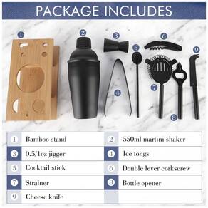 Kit de coquetel de bnO kit de bartender de mixologia inclui um agitador de aço inoxidável de 550mL, filtro, um copo medidor de tamanho duplo de 0,50mL , 1 oz, abridor de garrafas, pinça de gelo, faca de queijo, canudo de colher, saca rolhas de alavanca dupla e um suporte de bambu.