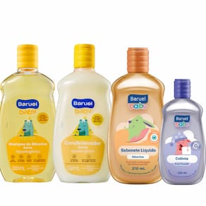 O kit é composto por: 1 Shampoo Baruel Suave Baby 210ml 1 Condicionador Baruel Suave Baby 210ml 1 Sabonete Líquido Baruel Com Glicerina Baby 210ml 1 Colônia Baruel Baby Sono Tranquilo 120ml