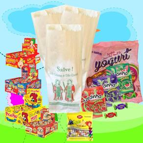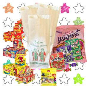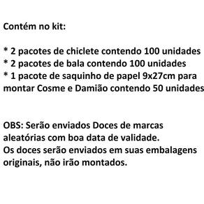 2 pacotes de chiclete contendo 100 unidades 2 pacotes de bala contendo 100 unidades 1 pacote de saquinho de papel 9x27cm para montar Cosme e Damião contendo 50 unidades