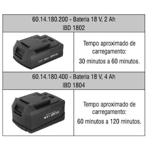Kit composto de 2 Baterias 18V 4Ah DWT - Bateria 18V lítio 4 Ah IBD 1804 DWT linha intercambiável Bateria de íons de lítio, garantindo alta eficiência de operação. Possui indicador de nível de carga. Os três LEDs vermelhos indicam o status de carga da bateria. Um LED aceso: indica baixa carga; dois LEDs acesos: metade da carga; e três LEDs acesos: bateria carregada. Possui entrada de ar para sistema de refrigeração, base emborrachada que ajuda a prevenir riscos em superfícies e absorver impactos leves. Indicada para a linha de ferramentas a bateria intercambiável DWT. Carregadores indicados: carregador de bateria 18 V ICBD 1805 6014180500 ou carregador de bateria carga rápida 18 V ICBD 1806 6014180600 . legal: 90 dias + contratual: 9 meses DETALHES TÉCNICOS Modelo:ibd1804 Tipo de bateria:Íons de lítio Tensão V :18 V Capacidade da bateria A :4,0 Ah Indicador de bateria fraca:Sim Massa aproximada peso :0,71 kg- - Marca: Não Informado Ean: 7908481207815