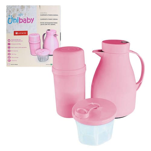 -Garrafa Paris 500ml; -Garrafa Fano 250ml; -Pote Dosador de Leite em Pó 300ml. -Capacidade para até 03 mamadeiras; -03 Doses de 95g; -08h Quente; -12h Frio; -Não pinga; -Atóxico.