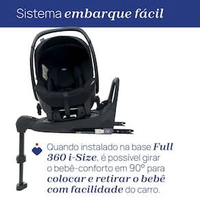 A Base Full 360 i-Size complementa o conjunto com instalacao facil via Isofix, giro inteligente e indicadores visuais que garantem uma fixacao correta, tornando o dia a dia dos pais muito mais pratico e seguro.