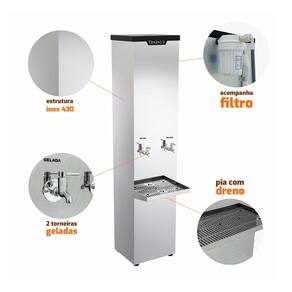 Especificações Bebedouro: - Modelo com 2 torneiras; - Revestimento interno do tanque em polipropileno; - Refrigeração através de gás refrigerante R-134a; - Isolamento térmico em poliuretano injetado; - Pia em aço inox 430, com dreno; - Serpentina interna em aço inox 304; - Acompanha filtro 5 e mangueira; - Termostato com 7 níveis de regulagem; - 4C no nível 7; - Pés com regulagem de altura; - Ideais para ambientes com grande circulação de pessoas; - Fácil instalação; - Revestimento externo em aço inox 430 brilhoso; - Tensão: 127V monofásico; - Sistema: Compressor; - Potência: 1/10HP; - Corrente: 2,1 A; - Medidas totais: 162,5cm A x 36cm L x 51,5cm CaracterísticasP; - Medidas da embalagem: 178cm A x 47cm L x 46cm P; - Peso Líquido: 32kg; - Peso Bruto: 45kg;