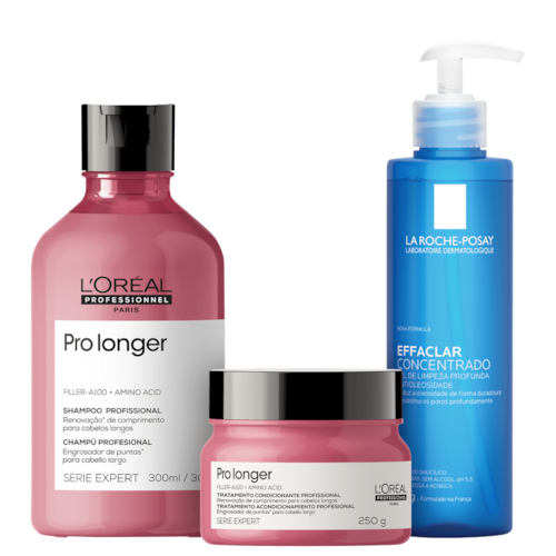 .Kit Beleza na Web L'Oréal Professionnel Pro Longer + La Roche-Posay Effaclar Concentrado é ideal para a rotina de skincare e cuidado capilar. Traz shampoo e máscara que promovem tratamento profissional de renovação de comprimentos para cabelos mais longos, densos e com brilho; e um gel de limpeza facial para peles oleosas a acneicas, que proporciona limpeza profunda, controle da oleosidade e eficácia antiacne.
