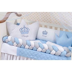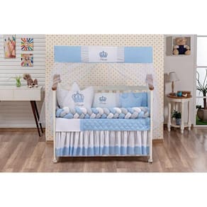 TOTAL 11 PEÇAS 1 Cabeceira------------------0.57 x 0.37 mts 1 Lateral -----------------------1.25 x 0.25mts 1 Trança --------------------1.25 x 0.12 mts 1 Lençol de cima ------------1.30 x 0.90 mts ------ 100% ALGODÃO 1 Fronha ---------------------0.28 x 0.38 mts ------ 100% ALGODÃO 1 Bando do mosqueteiro---1.40 x 0.20 mts 1 Mosqueteiro---------------4.50 x 1.50 mts 1 Edredom-------------------1.30 x 0.75 mts 1 Trocador -------------------0,50 x 0,40 mts 1 Almofada Coroa --------0.35 x 0.30 mts 1 SAIA BOX -------------1,30 x 0,70 x 0,30 mts Descrição das peças :Tecido estampado 100% algodão Tecido liso 100% poliéster Jogo de lençol tecido 100% ALGODÃO Enchimento 100% poliéster Mosqueteiro 100% poliamida Informações Importantes: O produto já vai pronto para o uso, com o enchimento já incluso. Acompanha as peças conforme a descrição, não esta incluso o Berço A cabeceira e as laterais do kit possuem zíper para retirar o enchimento, facilitando assim uma possível lavagem do produto.