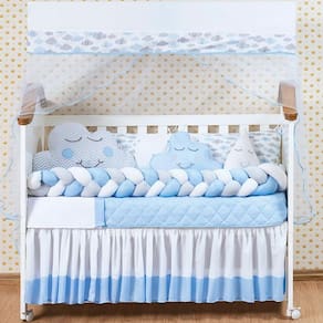 TOTAL 11 PEÇAS 1 Cabeceira------------------0.57X0.37 mts 1 Lateral -----------------------1.25X0.25mts 1 Trança --------------------1.25X0.12 mts 1 Lençol de cima ------------1.30X0.90 mts ------ 100% ALGODÃO 1 Fronha ---------------------0.28x0.38 mts ------ 100% ALGODÃO 1 Bando do mosqueteiro---1.40x0.20 mts 1 Mosqueteiro---------------4.50x1.50 mts 1 Edredom-------------------1.30X0.75 mts 1 Almofada nuvem --------0.40x0.20 mts 1 Almofada Gota ----------0,30 x 0,22 mts 1 SAIA BOX -------------1,30 x 0,70 x 0,30 mts Descrição das peças :Tecido estampado 100% algodão Tecido liso 100% poliéster Jogo de lençol tecido 100% ALGODÃO Enchimento 100% poliéster Mosqueteiro 100% poliamida Informações Importantes: O produto já vai pronto para o uso, com o enchimento já incluso. Acompanha as peças conforme a descrição, não esta incluso o Berço A cabeceira e as laterais do kit possuem zíper para retirar o enchimento, facilitando assim uma possível lavagem do produto. Marca: Não Informado