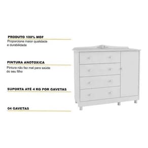 A Cômoda Infantil Elô complementa o kit com organização e funcionalidade. Produzida em 100% MDF, conta com 4 gavetas espaçosas e 1 porta com cabideiro interno, ideais para guardar roupas, fraldas, brinquedos e outros itens essenciais do dia a dia. Seu acabamento em pintura branca UV atóxica transmite leveza e modernidade, enquanto o sistema antitombamento, pés reguláveis e corrediças telescópicas garantem segurança e praticidade para a rotina da família.