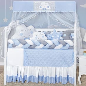 Kit berço com duas laterais formato nuvem 12 peças azul Kit berço nuvem 12 peças Atenção este é o melhor e mais completo kit berço do mercado Total 12 peças 1 cabeceira------------------0.60x0.40 mts 2 tranças -----------------------1.25x0.0,12mts 1 lençol de cima ------------1.30x0.70 mts 1 fronha ---------------------0.28x0.38 mts 1 bando do mosqueteiro---1.40x0.20 mts 1 mosqueteiro---------------4.50x1.50 mts 1 almofada nuvem --------0.40x0.20 mts 1 almofada lua ----------0,30 x 0,22 mts 1 almofada estrela---- 0,30 x 0,30 mts 1 saia box -------------1,30 x 0,70 x 0,30 mts 1 edredom--------------------130cm x 75cm Descrição das peças:Tecido estampado: 100% algodão Tecido liso: 50% algodão 50% poliésterEnchimento 100% poliésterMosqueteiro 100% poliamida Informações importantes:O produto já vai pronto para o uso, com o enchimento já incluso.Acompanha as peças conforme a descrição, não esta incluso o berçoA cabeceira e as laterais do kit possuem zíper para retirar o enchimento, facilitando assim uma possível lavagem do produto.