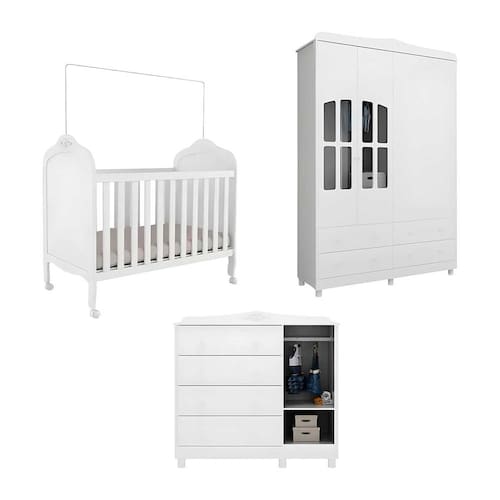 O Kit Berço, Cômoda e Guarda-Roupa Infantil Elô Peroba é a solução completa para montar um quarto infantil funcional, moderno e acolhedor. Produzidos em 100% MDF, com acabamento em branco e detalhes sofisticados, os móveis combinam praticidade, durabilidade e estilo para acompanhar todas as fases do crescimento do bebê.