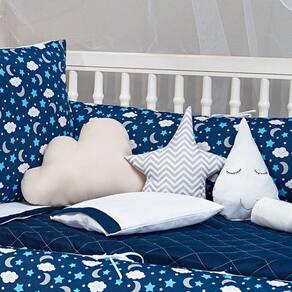 Kit Berço Estampado Universo Enxoval Berço Menino 8 Peças1 cabeceira------------------0.60x0.40 mts2 laterais -----------------------1.25x0.25mts1 bando do mosquiteiro---1.40x0.20 mts1 mosquiteiro---------------4.50x1.50 mts1 almofada nuvem --------0.40x0.20 mts1 almofada gota ----------0,30 x 0,22 mts1 almofada estrela---- 0,30 x 0,30 mtsDescrição das pecas :Tecido estampado: 100% algodãoTecido liso: 50% algodão| 50% poliésterEnchimento 100% poliésterMosquiteiro 100% poliamida Informações importantes:O produto já vai pronto para o uso, com o enchimento já incluso.Acompanha as peças conforme a descrição, não esta incluso o berçoA cabeceira e as laterais do kit possuem zíper para retirar o enchimento,Facilitando assim uma possível lavagem do produto.