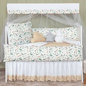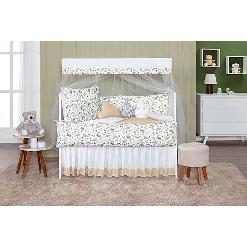 O kit segue o padrão americano de medidas e é confeccionado com tecidos de alta qualidade. O tecido estampado é 100% algodão, o tecido liso é 50% algodão e 50% poliéster, o enchimento é 100% poliéster e o mosquiteiro é 100% poliamida.