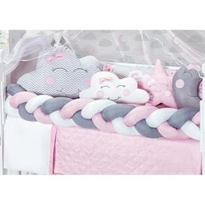 Kit berço nuvem rosa feminino com trança e lateral 12 peças Kit berço nuvem 12 peças Atenção este é o melhor e mais completo kit berço do mercado Total 12 peças 1 cabeceira------------------0.60x0.40 mts 1 tranças -----------------------1.25x0.0,12mts 1 laterais -----------------------1.25x0.25mts 1 lençol de cima ------------1.30x0.70 mts 1 fronha ---------------------0.28x0.38 mts 1 bando do mosqueteiro---1.40x0.20 mts 1 mosqueteiro---------------4.50x1.50 mts 1 almofada nuvem --------0.40x0.20 mts 1 almofada lua ----------0,30 x 0,22 mts 1 almofada estrela---- 0,30 x 0,30 mts 1 saia box -------------1,30 x 0,70 x 0,30 mts 1 edredom--------------------130cm x 75cm Descrição das peças:Tecido estampado: 100% algodão Tecido liso: 50% algodão 50% poliésterEnchimento 100% poliésterMosqueteiro 100% poliamida Informações importantes:O produto já vai pronto para o uso, com o enchimento já incluso.Acompanha as peças conforme a descrição, não esta incluso o berçoA cabeceira e as laterais do kit possuem zíper para retirar o enchimento, facilitando assim uma possível lavagem do produto.