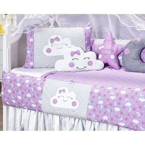 Com esse jogo de berço, você terá tudo o que precisa para deixar o cantinho do seu bebê ainda mais aconchegante e charmoso. Além disso, o design com nuvens e tons de lilás traz um toque de delicadeza e suavidade ao ambiente.