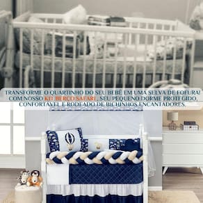 A chegada de um bebê muda tudo... E o quartinho precisa estar à altura desse momento mágico Esse kit berço foi pensado com muito carinho pra abraçar seu bebê com segurança, transformar o berço em um lugar aconchegante e ainda encher o ambiente de charme e alegria com a estampa safari marinho.