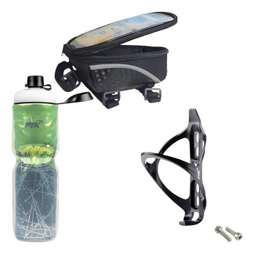 - Garrafa Térmica 700ml: Mantenha sua água gelada por até 3 horas, com bico higiênico e fluxo ajustável. - Suporte Universal: Design seguro e resistente para fixar sua garrafa em qualquer bike. - Porta Celular Universal: Protege seu smartphone contra intempéries e permite uso da tela, ideal para GPS e músicas.