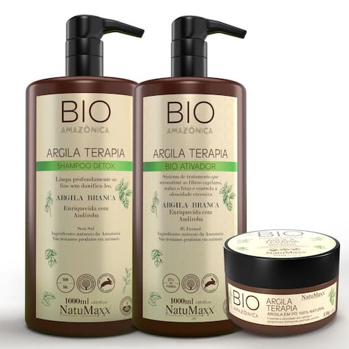 O Shampoo Detox Bio Amazônica limpa profundamente os fios sem danificá-los. Sua fórmula balanceada controla o pH e prepara os fios para receber o tratamento bio ativado. O Gloss Bio Ativador Bio Amazônica é um tratamento para alinhamento orgânico e redução de frizz. A Argila em Pó Bio Amazônica reduz a oleosidade do cabelo.