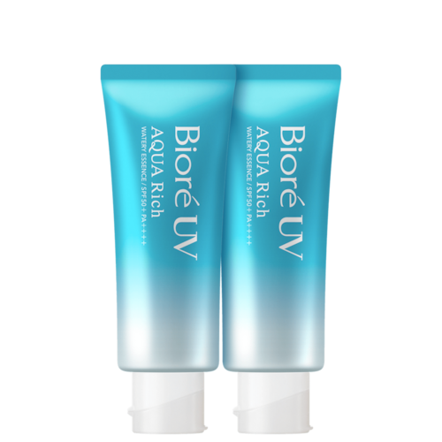 Kit com protetores solares para rosto e corpo. Bioré Aqua Rich Watery Essence FPS 50 com textura macia e refrescante como água, traz a sensação de pele fresca e leve enquanto oferece alta proteção UVA e UVB.