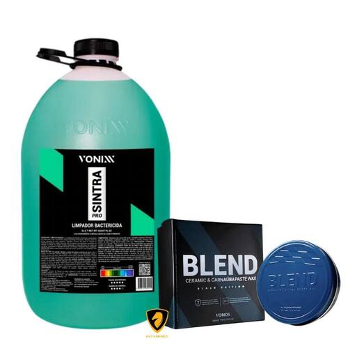 Kit blend black pasta + sintra pro 5l Kit blend black pasta 100g + sintra pro 5l vonixx Blend ceramic & carnaúba paste wax - black edition Cera com sio2 e carnaúba especial para carros escuros Blend ceramic & carnaúba paste wax - black edition é uma cera híbrida especialmente desenvolvida para carros de cor escura, principalmente os de cor preta. Composta por sio2 e pela mais pura carnaúba tipo 1, protege a superfície veicular por até sete meses. O produto promove a resistência cerâmica, brilho quente da carnaúba e hidrorrepelência. -durabilidade Até sete meses de proteção. -caracteristicas Até 7 meses de proteção Rende até 25 aplicações Restaura o brilho de carros escuros, principalmente os de cor preta -modo de uso 1- lavar o veículo; 2- aplicar o produto com um aplicador de espuma, fazendo movimentos uniformes; 3- aguardar de 5 a 10 minutos; 4- remover o produto com uma toalha de microfibra limpa e seca; 5- para obter mais brilho e proteção, aplicar uma segunda camada. Sintra pro - limpeza interna de veículos Limpador bactericida Descrição Sintra pro - limpeza interna é um multilimpador flotador bactericida de ph balanceado e ultra concentrado, indicado para limpeza de painéis, laterais e cantos de portas, bancadas de couro, carpetes e estofados. Promove alto poder de remoção de manchas de gordura e sujeiras diversas, além de eliminar microrganismos causadores de doenças no interior do veículo. A baixa espumação o torna ideal para ser Utilizado em extratoras, eliminando as sujidades do interior do veículo e deixando-o limpo novamente. Sintra pro diminui maus odores no interior do veículo, tornando-o mais saudável e livre de impurezas. Ph Alcalino Diluição Limpeza de laterais de portas, plásticos e couro muito encardido - 1:5. Carpetes, estofados e limpeza de teto - 1:10 sujeira pesada ; 1:20 sujeira média ; 1:30 sujeira leve . Manutenção de limpeza interna em painéis, laterais de portas e bancos de couro - 1:50. Observação: em extratoras com diluição de até 1:60 e em tornador com diluição 1:10. Uso recomendado Painéis, couro, carpetes, estofados. Informações adicionais Produto alcalino. Não recomendamos realizar a aplicação em vidros automotivos. Leia atentamente o rótulo antes de utilizar o produto. Ultra concentrado Limpa sem agredir O kit inclui: 1x blend black pasta 100g vonixx 1x sintra pro 5l vonixx