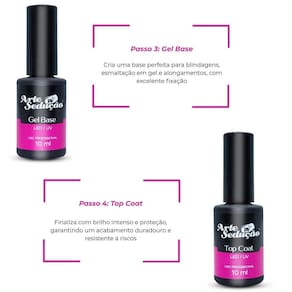 Este kit Arte Sedução para blindagem de unhas é perfeito para fortalecer e proteger as unhas naturais, prevenindo quebras e descamações O kit conta com 4 itens: Um Regulador de pH Desidratador que equilibra o pH e remove a umidade da unha, garantindo uma melhor adesão dos produtos seguintes. O Primer sem Ácido proporciona uma maior aderência sem agredir a pele e a lâmina da unha, sendo especialmente indicado para unhas sensíveis. O kit também conta com um Gel Base Transparente que cria uma base perfeita para blindagens, esmaltação em gel e alongamentos, com excelente fixação. E um Top Coat Finalizador que finaliza a blindagem com um brilho intenso e proteção, garantindo um acabamento duradouro e resistente a riscos. Ideal para quem busca por uma blindagem de unhas completa com excelente qualidade e um ótimo custo-benefício.