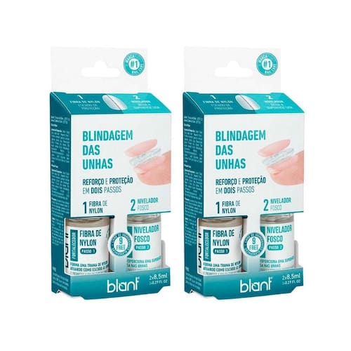 Contem 2 frascos de 8,5ml. Escudo de proteção das unhas que permite seu crescimento saudável, evitando que sofram com impactos, descamação e quebras. Reforço e Proteção em dois passos. Passo 1 Fibra de Nylon - Fortalece e promove resistência através de uma trama de nylon que protege a unha de qualquer agressão e choque, evitando quebras e descamações. Passo 2 Nivelador Fosco - Proporciona uma superfície lisa nas unhas, cobrindo as fibras ásperas de nylon. Prepara a unha para receber a esmaltação. Livre de ingredientes alérgicos.