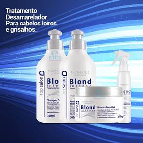 O Kit Blond Intense foi desenvolvido especialmente para o cuidado dos cabelos loiros, grisalhos e com mechas, que passam por processos químicos como colorações, tornando-se muita vezes amarelados, opacos e ressecados. Com aminoácidos, Pró Vitamina B12, Filtro UV, Cálcio e Cera de Soja promoverá aos fios nutrição e fortalecimento. Esse conjunto irá eliminar o efeito amarelado sem ressecar o cabelo, promovendo o efeito matizado e realçando as nuances prateadas.