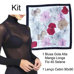 Kit Blusa Segunda Pele Gola Alta Manga Longa Fio 40 Tamanho 38/44 + 1 Lenço Cetim Estampa diversa 90x90. Blusa confeccionada com malha finíssima para ser usada em baixo da roupa ou com sobreposições, permitindo versatilidade no visual. Modelagem em manga longa, possui transparência, elasticidade e caimento justo. Qualidade Selene. Gola alta Fio 40. Cor disponível: Preto. Composição: 98% Poliamida, 2% Elastano. Produto delicado. Acompanha também 1 lenço em cetim modelo quadrado grande: 90 x 90 cm - 100% poliéster. Perfeito para uso casual ao ar livre e demais ocasiões. Proporciona diversas amarrações, podendo ser utilizado como top, cropped, faixa, lenço, bandana, no pescoço, como cachecol, echarpe, na lateral da bolsa, como cinto, etc. Possui toque de seda suave, cores lindas e vibrantes. Diversas maneiras de combinar, use sua criatividade. Modelos e e diversas sem possibilidade de escolha. Todos os modelos são lindos e modernos. Dica: Para que o lenço fique maior e permita muitas combinações, dobre-o na diagonal e inicie as amarrações desejadas. Para maior durabilidade e conservação, lavar à mão e secar a sombra. Kit completo para você se manter aquecida e elegante em qualquer ocasião. Contém: 1 Blusa Gola Alta Manga Longa Fio 40 Preta + 1 Lenço Cetim 90x90 diverso = 2 Produtos. Fotos ilustrativas e reais do produto.