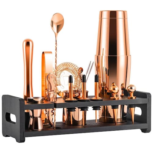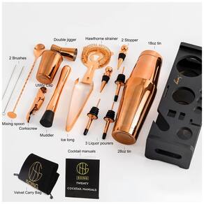 UM CONJUNTO COMPLETO PARA MISTURAR Conjunto de ferramentas de bar de 24 peças de acessórios de bartender de alta qualidade. Com nosso livreto de receitas especiais, não importa se você já fez coquetéis sozinho, agora você pode experimentá lo sem hesitação seria sempre uma boa escolha Hora de compartilhar sua própria bebida com seus amigos e familiares METARIAL DE ALTA QUALIDADE Alta resistência à abrasão e à prova de ferrugem. Todos os acessórios são feitos de SS304 e SS430. Qualidade superior garantida UM PRESENTE PERFEITO E ÚNICO O kit de bn Soing seria um presente maravilhoso para seus amigos e familiares, seja aniversário, casamento, aniversário ou natal. Com nossa caixa de presente elegante, acreditamos que eles vão adorar seu presente FÁCIL DE LIMPAR E ZENAR Com nosso suporte específico, você não precisa mais se preocupar em perder acessórios de coqueteleira. Ele pode não apenas zenar bem suas ferramentas de barra, mas também pode ser como um belo ornamento Para evitar arranhar a superfície do seu conjunto de barras, recomendamos lavar as mãos
