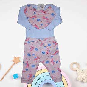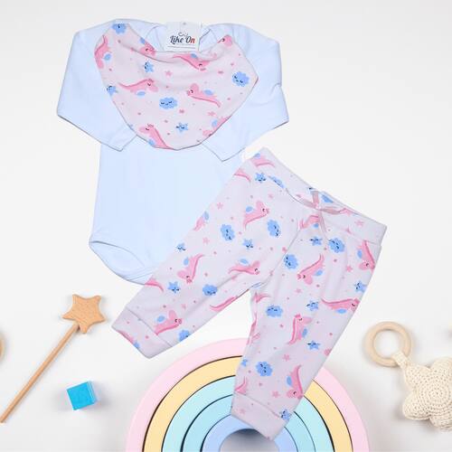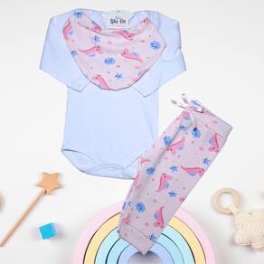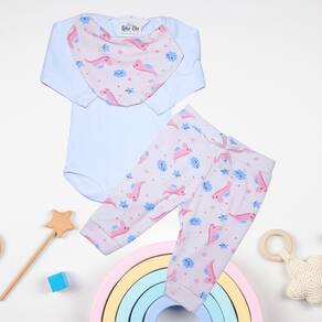 O kit Body Like On é um conjunto de roupas infantis composto por um body, uma calça e uma bandana babador. A composição do tecido é especialmente pensada para garantir conforto e durabilidade, sendo 70% algodão e 30% poliéster.