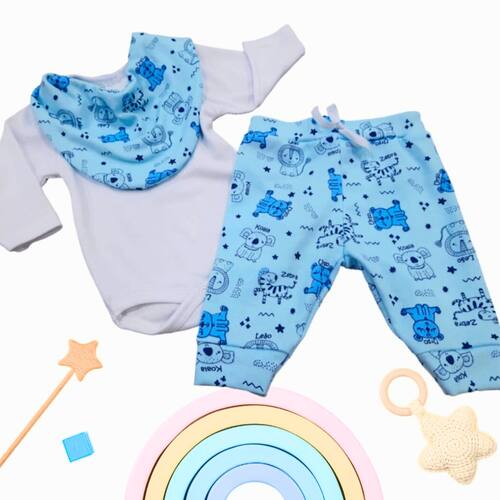 O kit Body Like On é um conjunto de roupas infantis composto por um body, uma calça e uma bandana babador. A composição do tecido é especialmente pensada para garantir conforto e durabilidade, sendo 70% algodão e 30% poliéster.