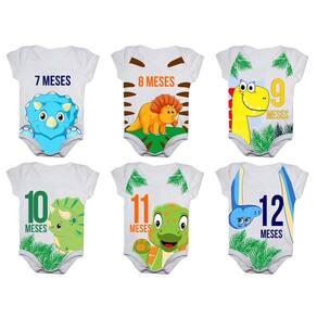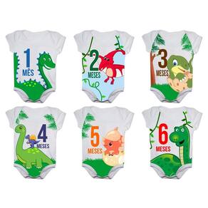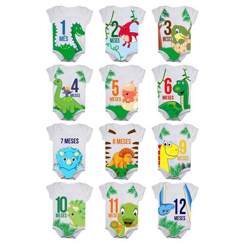 Body de Bebê Mesversario Manga Curta - Kit com 12 peças. Tecido: 96% poliéster, 04% elastano. Toque macio e confortável. Estampa sublimada de alta qualidade com tinta atóxica, não causa danos e alergias aos bebês. Tamanhos: 1 a 2 meses P / 3 a 5 meses M / 6 a 8 meses G / 9 a 12 meses GG.