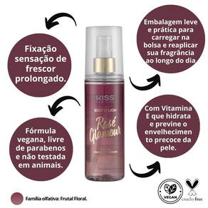 Rosé Glamour celebra aquele amor leve, mas extremamente envolvente. Uma fragrância frutal adocicada deliciosa e divertida, com notas de cassis, pêssego e abacaxi, envoltas pelo dulçor do caramelo e da baunilha. Fórmula vegana, livre de parabenos e com Vitamina E que hidrata e previne o envelhecimento precoce da pele. Não testada em animais Família Olfativa: Frutal Adocicado Pirâmide Olfativa Saída: Cassis, Maracujá e Abacaxi. Corpo: Caramelo, Pêssego e Ameixa. Fundo: Musk, Framboesa, Baunilha