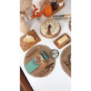 Este é um conjunto prático e elegante para armazenar e servir pães, tortas, bolos pequenos, manteiga e frios na sua cozinha ou mesa posta. O conjunto é composto por uma boleira, uma manteigueira e um porta frios, tudo feito de bambu, um material natural e resistente.