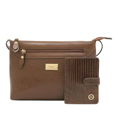 O Kit Bolsa Couro Transversal 2193MRT e Carteira 237MRT é uma ótima sugestão para renovar os conceitos de elegância e praticidade aos dias das mulheres de fino trato. Confeccionada em couro de espessura média, combina elementos clássicos e toques modernos para destacar a composição em diversas situações urbanas. Conhecendo o modelo: Bolsa Couro Transversal Mariart 2190MRT Corpo: Construção em couro de espessura média e acabamento tipo croco italiano. Forro em sarja engomada produzida em blend de poliéster e algodão. Logomarca aplicada com placa metálica. Fechamento: Zíper em poliéster de tramas levemente espaçadas para melhor lacre. O cursor em metal ZAMAC que corre macio nos dentes e não enferruja. Parte externa: Bolso nas frente da bolsa que pode ser utilizado para acomodar aparelhos celulares, por exemplo. Alças: Alça transversal com reforço interno com recouro e seis níveis de regulagem que vai de 1,20m a 1,35m. Parte interna: Bolso saque rápido indicado para chaves e celulares. Bolso com fechamento em zíper para acomodar itens mais valiosos. Fundo: Base firme para melhor estabilidade em superfícies. O que cabe Celular, pertences pequenos molho de chaves, fones de ouvido , nécessaire de higiene pessoal, estojo de maquiagem. Dependendo do tamanho não cabem todos os itens acima de uma vez. O que não cabe Notebooks, guarda-chuvas grandes, livro, caderno universitário, malha para os dias de frio, tablet, squeeze ou qualquer pertence considerado de médio pra grande. Recomendações de uso: Perfeita para o uso diário, como por exemplo, ir ao mercado ou curtir um happy hour com os amigos Como conservar o couro da sua bolsa: Para eliminar sujeiras leves recomendamos usar pano umedecido com sabão neutro. Dimensões: 26 x 18 x 05 cm comprimento x altura x largura Material: couro lezard Origem: nacional; feita por mãos brasileiras Conhecendo o modelo: Carteira Couro Mariart 237MRT Corpo: Construção em couro firme de espessura média para maior durabilidade. Forro misto de poliéster e algodão. Logomarca prensada em relevo na parte interna. Fechamento: Haste com botão . Parte interna: Dois bolsos livres para cédulas dobradas. Três slots para cartões que comportam até 6 unidades considerando utilizar 2 cartões por slot . Núcleo de PVC para acomodar documentos como RG, CNH e título de eleitor. Parte externa: Logo metálico dourado aplicado na parte frontal. O que cabe RG, CNH, título de eleitor, documento veicular, cartões, cédulas dobradas. O que não cabe Passaporte, carteira de vacinação, certidão de nascimento, talão de cheque, moedas. Recomendações de uso: Ótima para transportar em bolsas pequenas, pochetes e bolsos de casacos. Cuidados com o couro: Para fazer a limpeza do couro utilize um pano úmido com sabão neutro. Não usar substâncias abrasivas, nem qualquer prática de lavagem. Dimensões: 12,5 x 09 x 02 cm comprimento x altura x largura Material: couro Origem: nacional; feita por mãos brasileiras
