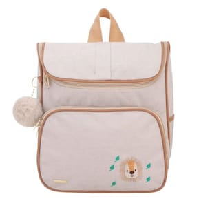 Mochila possui alças de costas e bolso frontal com fechamento em zíper