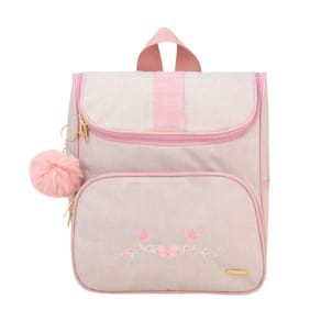 Mochila possui alças de costas e bolso frontal com fechamento em zíper