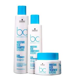 O kit Schwarzkopf Professional BC Bonacure Clean Performance Moisture Kick Trio apresenta fórmula que ajuda a equilibrar o nível ideal de hidratação dos cabelos sem pesar nos fios.