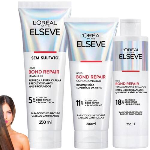 1 Bond Repair Shampoo Loreal Paris Elseve - 250ml 1 Bond Repair Condicionador Loreal Paris Elseve - 200ml 1 Bond Repair Tratamento Pré Shampoo Loreal Paris Elseve - 200ml