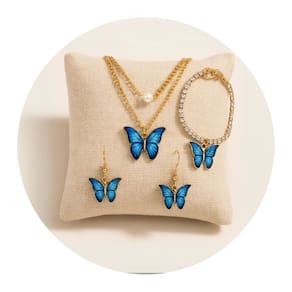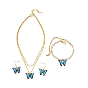 Kit Bijuteria Borboleta Azul Colar Brinco Pulseira Festa é a escolha ideal para quem busca um toque delicado e elegante no visual. O conjunto conta com colar de corrente dourada dupla com pingente de borboleta azul vibrante e pérola central, brincos pendentes com o mesmo design encantador e pulseira ajustável com aplicação idêntica. Perfeito para ocasiões especiais como festas, casamentos e jantares, esse kit valoriza produções românticas e femininas. Também é uma excelente opção de presente criativo para quem ama acessórios com personalidade e charme.