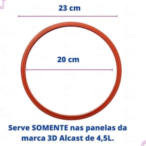 Nosso empenho é procurar o que há de mais atual e funcional no mundo culinário e para organização da sua casa, priorizando sempre a qualidade e a versatilidade dos produtos. Kit borracha panelas 3d alcast de 4,5l Este kit contém: 1 borracha de silicone para panelas 3d alcast de 4,5 litros de fechamento externo 2 válvulas de segurança de borracha 1 peso pino preto e vermelho Atenção: não serve para panela 3d alcast de 5,5 litros Para este modelo tem outra borracha específica, verifique nossos demais anúncios. Esta borracha servirá somente para panelas 3d alcast com fechamento externo de 4,5 litros. As borrachas de silicone 100% atóxico, não ressecam, são melhores para o desempenho da sua panela, fazendo com que a vedação seja total O anel de vedação deve ser substituído sempre que ficar rígido ou quebradiço. Medidas da borracha: Diâmetro externo: 23 cm Diâmetro interno: 20 cm; Fique atento à algumas dicas de uso: - jamais coloque a panela quente embaixo da água fria, esse choque térmico causa deformidades no alumínio; - mantenha sempre o pino central limpo, faça a limpeza com algo de metal, não use palito de dente, ele pode quebrar e você precisará trocar a peça; - prefira cozinhar em fogo baixo, o tempo é o mesmo e evita que a água seque mais rápido. Manutenção em dia = panela segura Gostou Esse produto pode ser seu aguardamos sua compra Marca: Não Informado