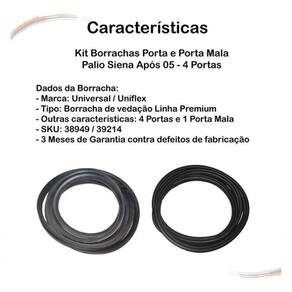 Kit Borrachas Porta E Porta Mala Palio Siena Após 05 4 Pts - Un / 5 [f103] CONTEÚDO DA EMBALAGEM: - 04 Borrachas de porta Linha Premium - 01 Borracha do Porta Malas Linha Premium APLICAÇÃO NOS SEGUINTES VEÍCULOS: Fiat: - Palio G2 Após 2005 - Siena G2 Após 2005
